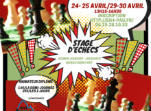 Frédéric Baches, initiateur diplômé de la Fédération Française des Échecs proposera un stage sur 3 après-midis les 8, 9 et 10 Juillet. Programme détaillé ICI Contact mail : echiquierh4@gmail.com Contact téléphonique : 06.19.28.10.33